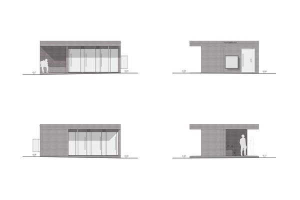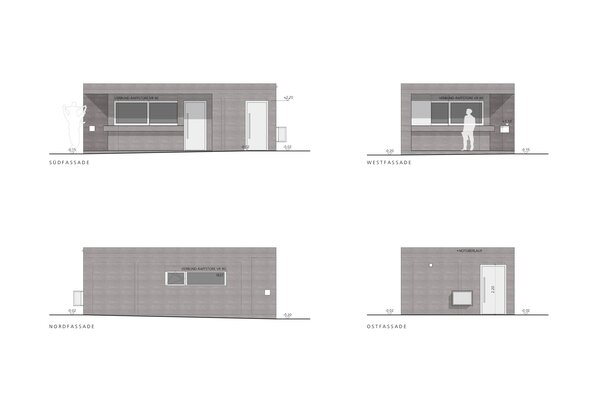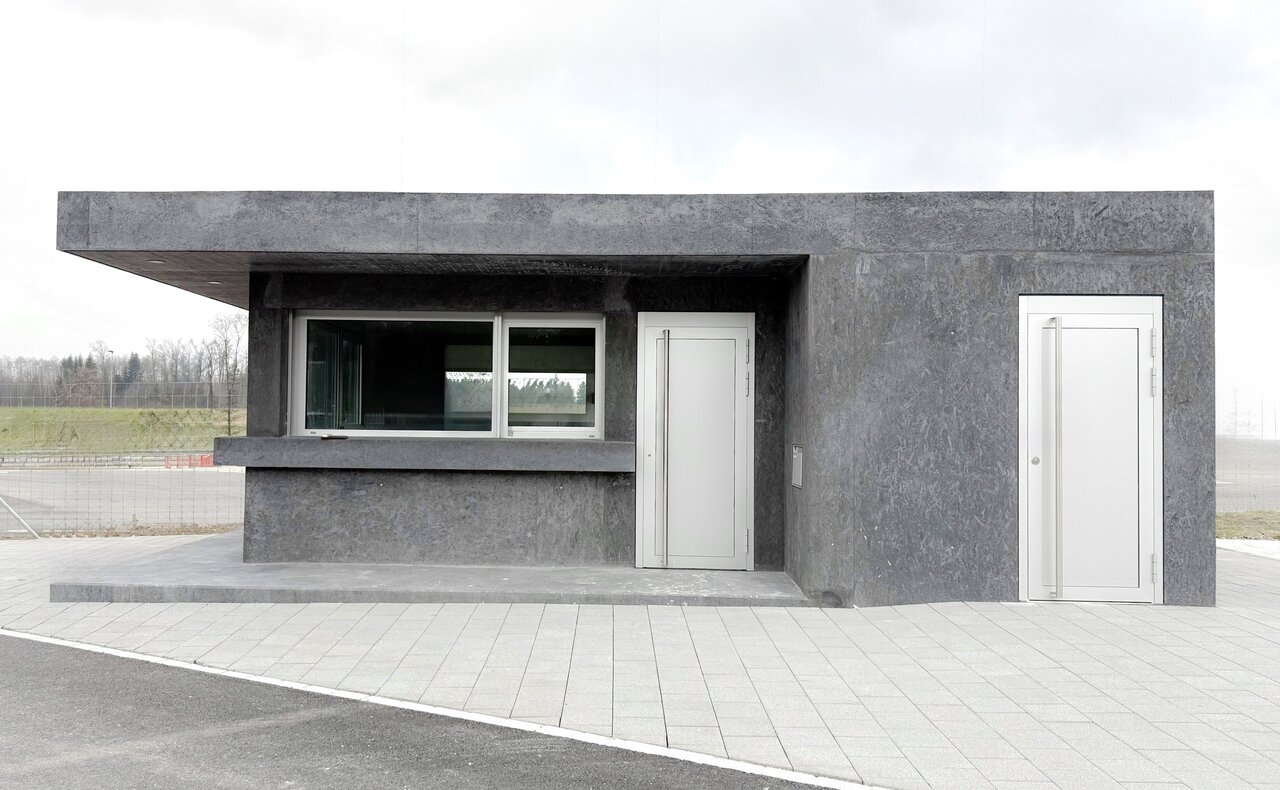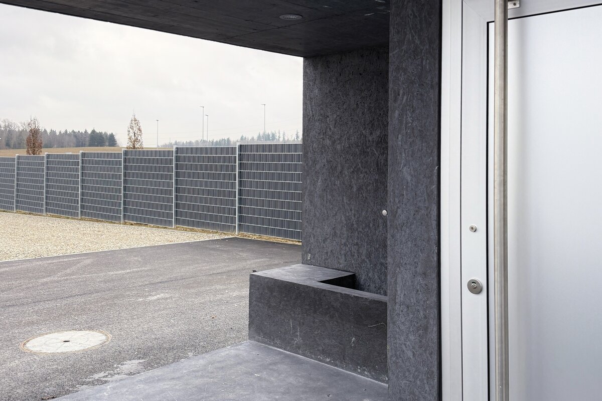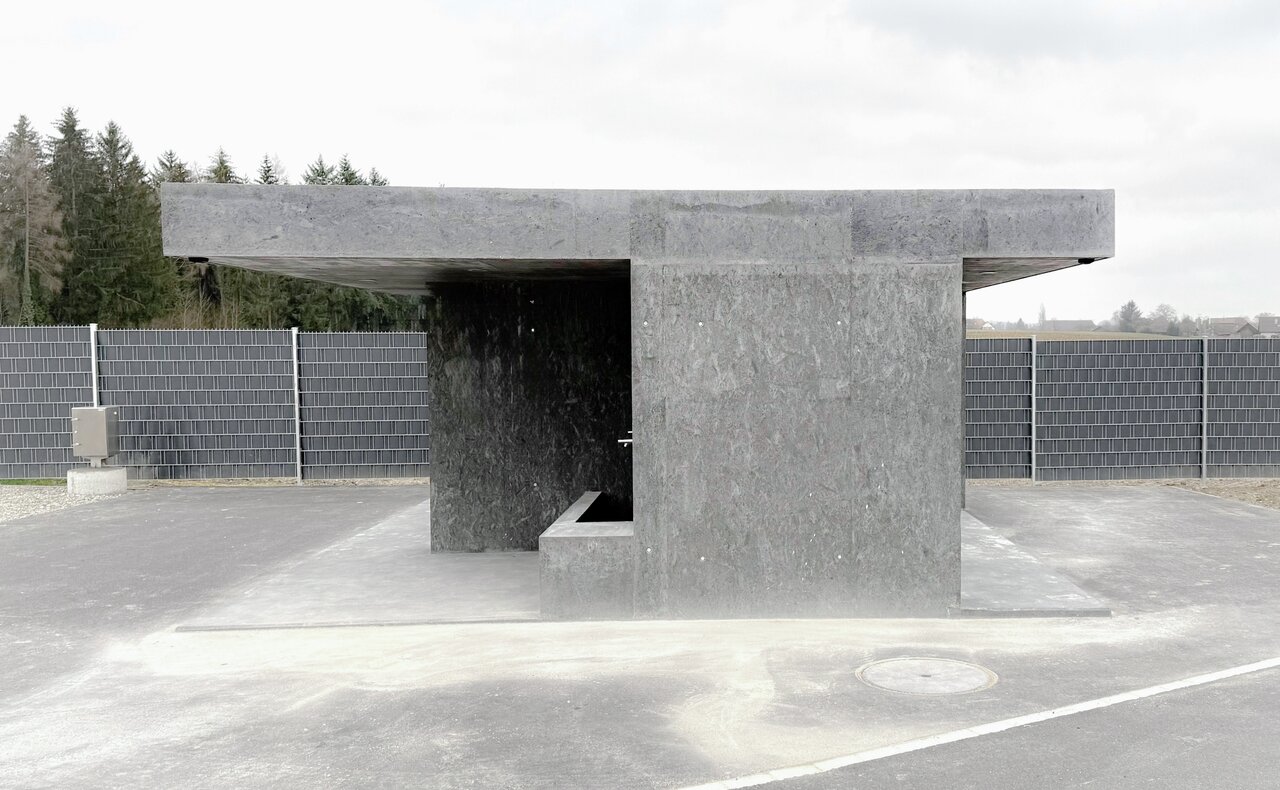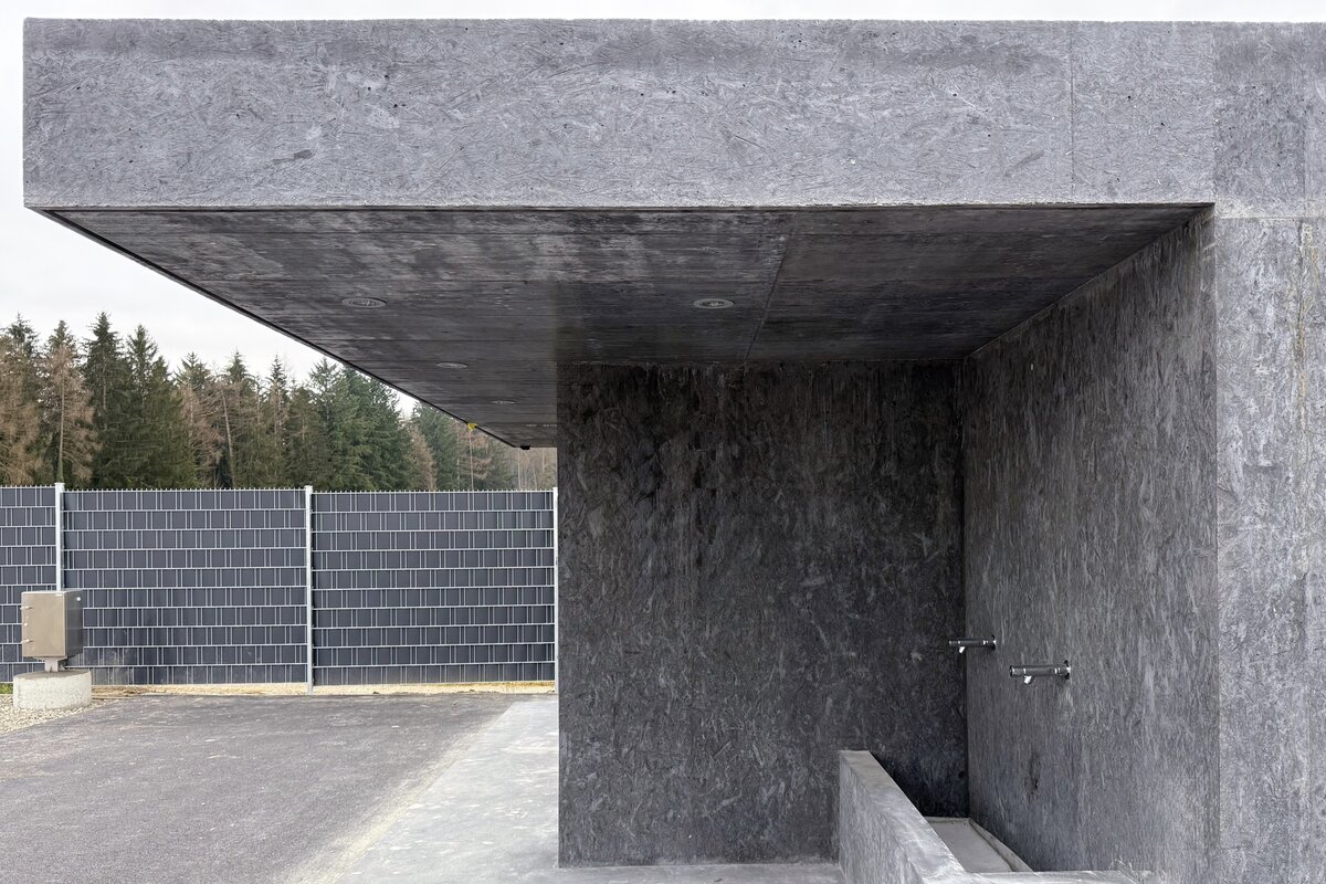 Die Architektur der schlichten Betonbauten vereint Beständigkeit mit einer skulpturalen monolithischen Formensprache, die den Pavillons eine eigenständige Identität verleiht. Die Betonoberflächen wurden mit Schalungen aus OSB-Grobspanplatten gefertigt, wodurch die Struktur der Holzspäne im Beton sichtbar wird. Diese lebendige Textur des anthrazitfarbig eingefärbten Betons erinnert an die Optik von Naturstein und schafft so eine subtile Verbindung zu einem typischen Material unseres Landes.