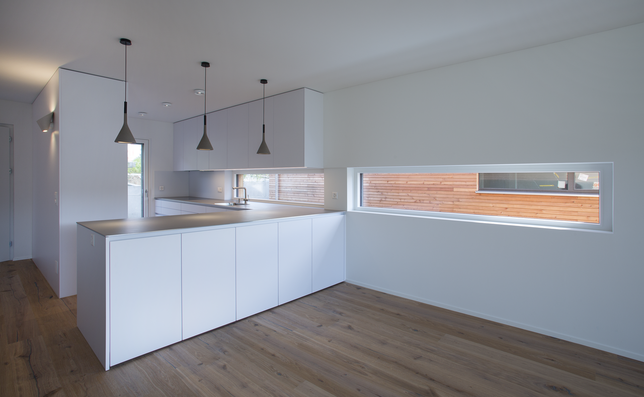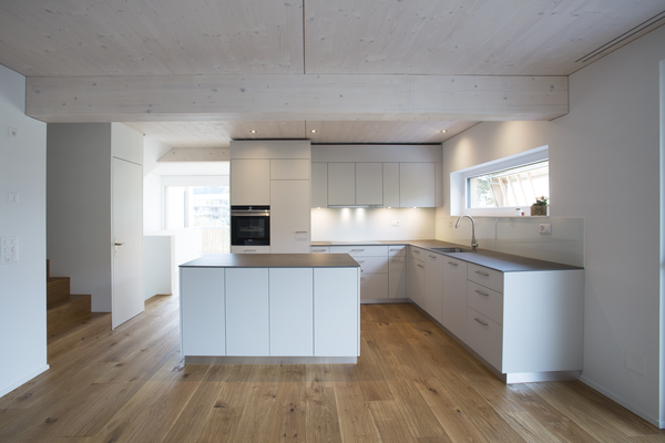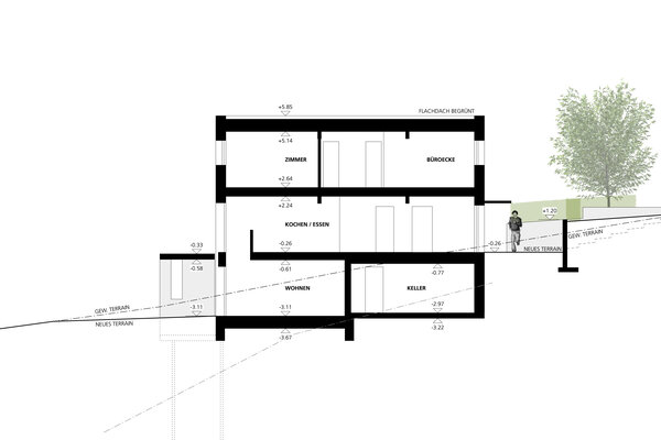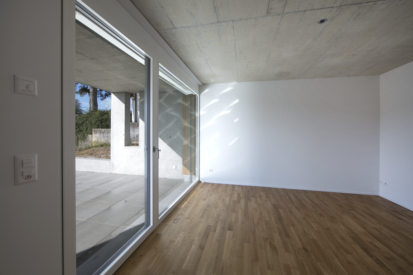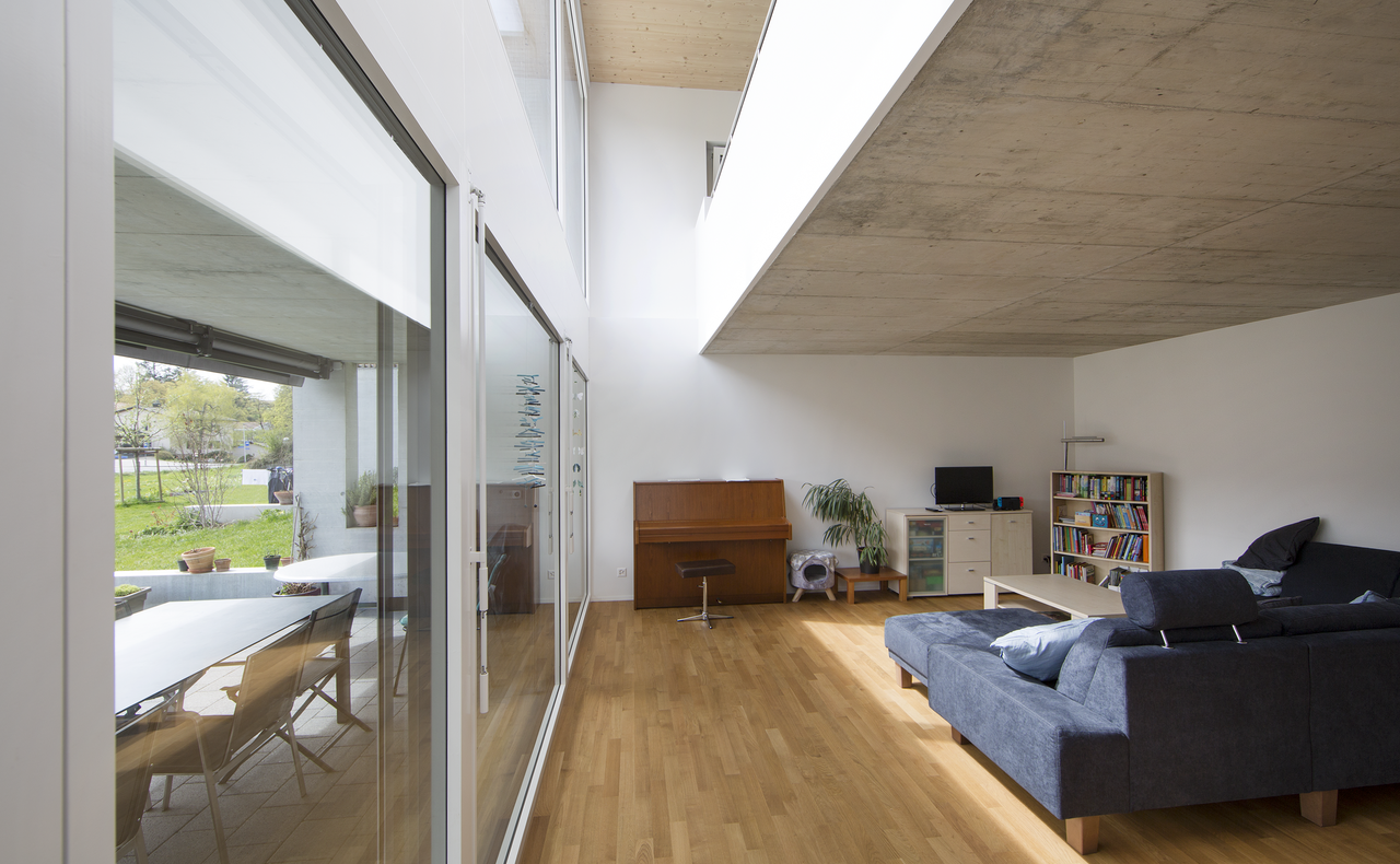 Die Häuser nehmen Bezug auf die Hanglage, indem das Wohnen südseitig über drei Stockwerke organisiert wird. Hohe Wohnräume mit grossen Fensterflächen schaffen eine Verbindung zur Natur, während zugleich ein angenehmes Wohnklima mit viel Tageslicht geschaffen wird.