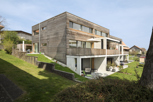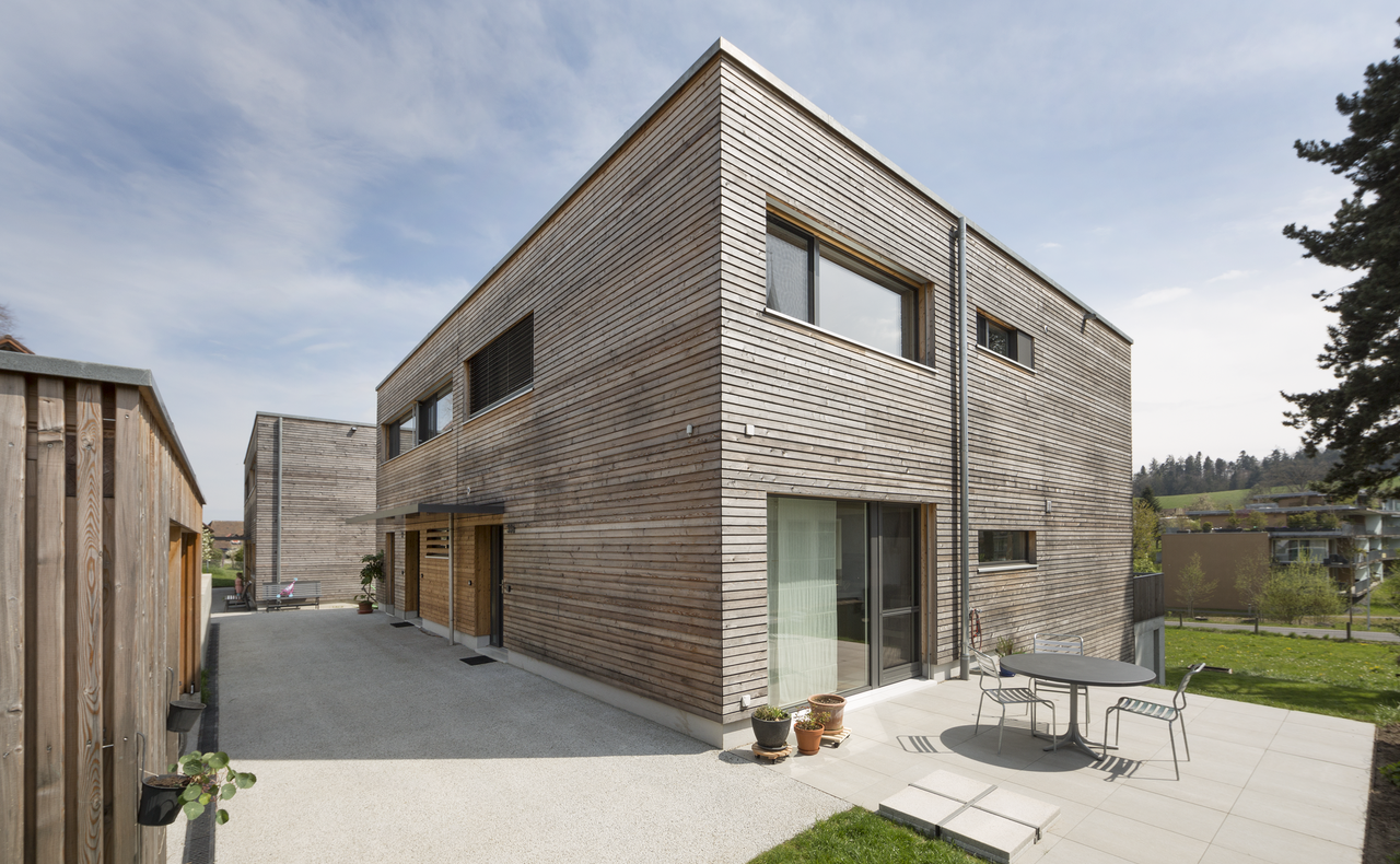Auf einem freien Grundstück am Siedlungsrand von Bern - in ländlicher Umgebung zwischen Kirche und Käserei gelegen - entstanden vier Wohnhäuser in moderner Holzbauweise.