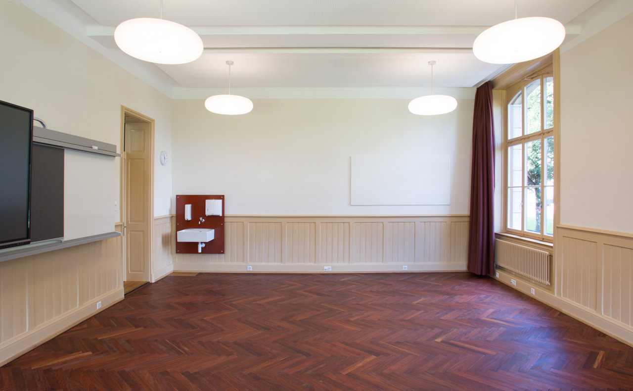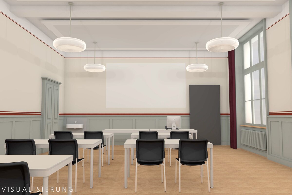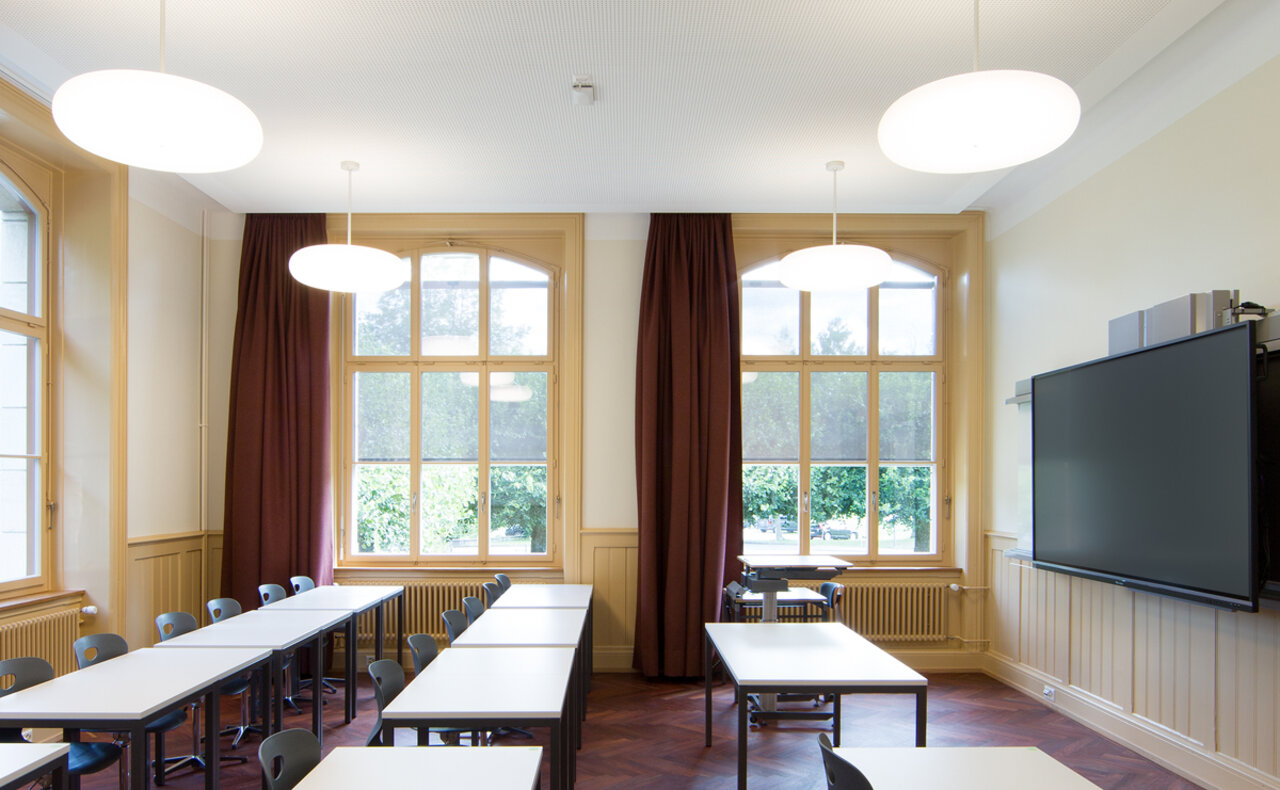 Eine besondere Herausforderung war die Integration der technischen Infrastruktur für einen zeitgemässen Unterricht. Es galt, die technischen Anforderungen mit dem historischen Charakter des Gebäudes, insbesondere den am Bestand orientierten Details, in Einklang zu bringen.