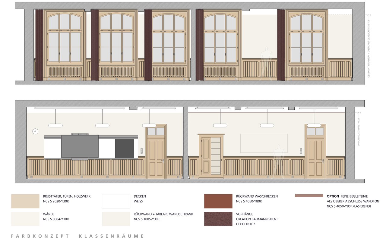 Das Projekt umfasste die Erarbeitung eines verbindlichen Farb- und Materialkonzeptes für die Klassenräume des Gymnasiums und eine entsprechende Umsetzung mit einer ersten Sanierungsetappe. Die Aufgabe bestand in der vertieften Auseinandersetzung für Sanierungs- und Restaurationsmassnahmen, die den historischen Wert des Gebäudes berücksichtigen und die gleichzeitig die Klassenräume für die Bedürfnisse eines modernen Unterrichts fit machen.