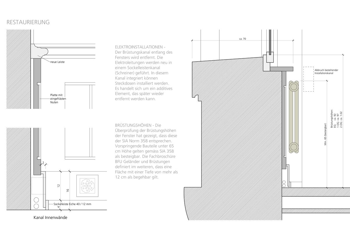 Ein wichtiges Detail war der Ersatz der schweren Installationskanäle, die optisch störend unter den Fenstersimsen verliefen. Wir entwickelten eine Lösung, bei der die notwendigen Installationen diskret hinter der Sockelleiste verlaufen, um das ursprüngliche Erscheinungsbild des Raumes zu bewahren.
