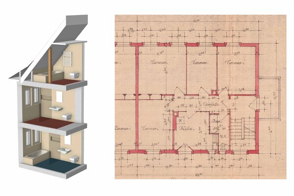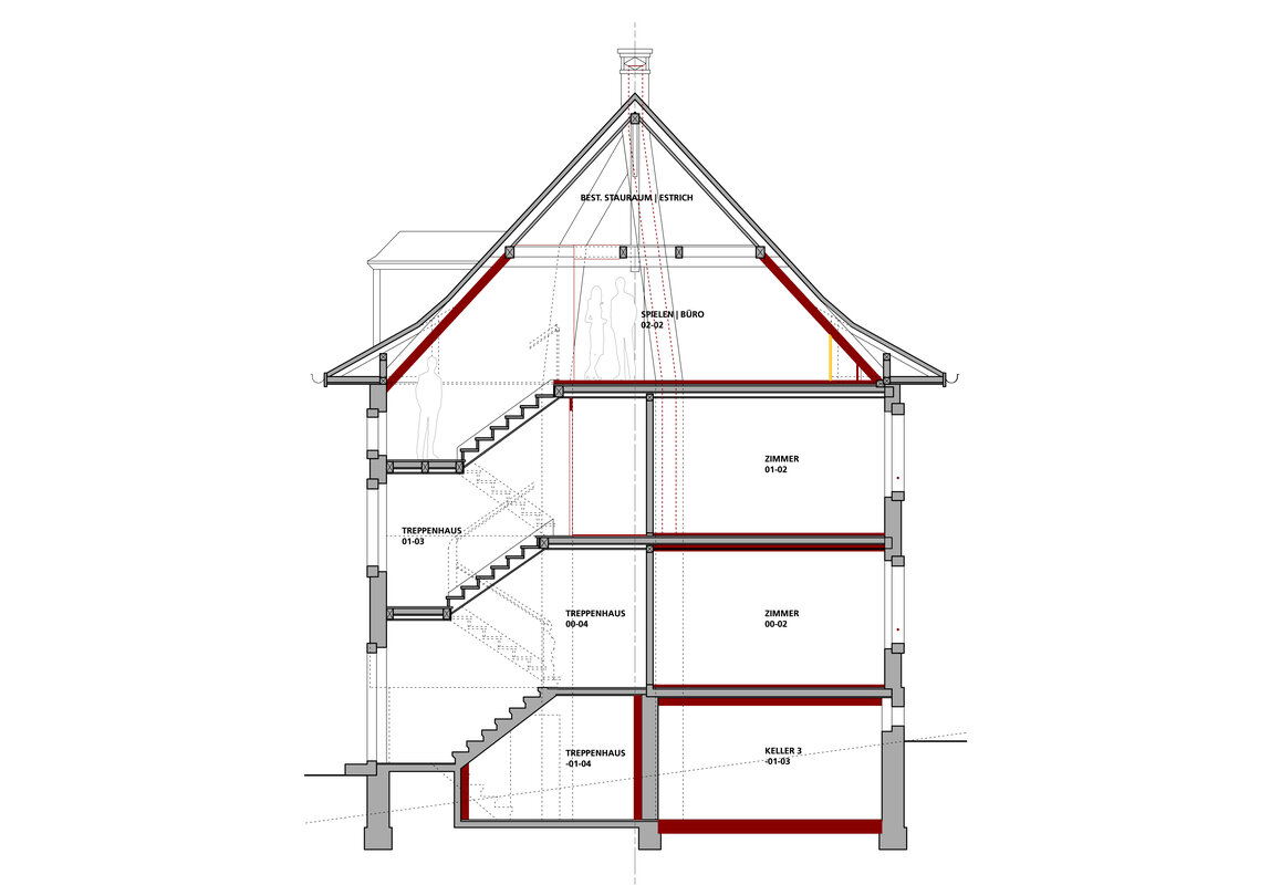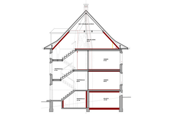 Das Projekt orientierte sich stark an den ursprünglichen bauzeitlichen Strukturen. Dazu wurden die Überlagerungen von späteren Eingriffen zurückgebaut und repariert. Wo es die neuen Nutzungen erlaubten, wurden bestehende Bauteile wiederverwendet und saniert. In enger Zusammenarbeit mit der Denkmalpflege und einer Farbberaterin konnten durch die Wahl der Materialien und Farben der historische Charakter des Hauses gestärkt werden. Zudem wurden am Gebäude wesentliche Ertüchtigungen in den Bereichen Erdbebenstatik und Brandschutz vorgenommen.